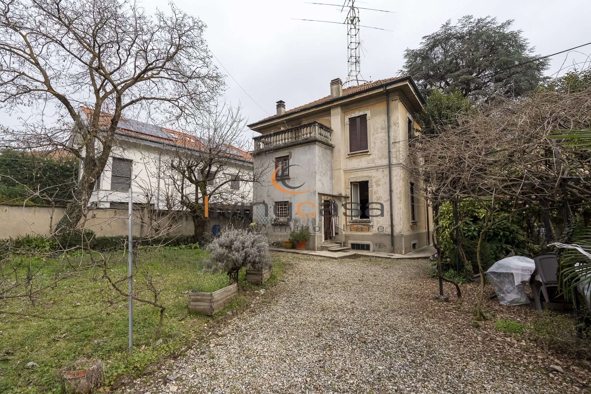 Una villa del 1928, indipendente, circondata dal verde del proprio giardino, nel cuore del paese.
