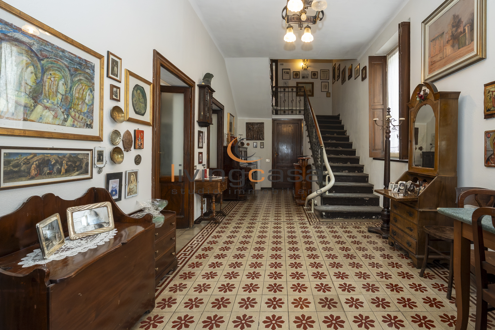 Entrando al piano terra di circa 93 mq si viene accolti da un ampio ingresso con la scala centrale che accompagna ai piani superiori e dona subito il carattere tipico delle ville d’epoca.