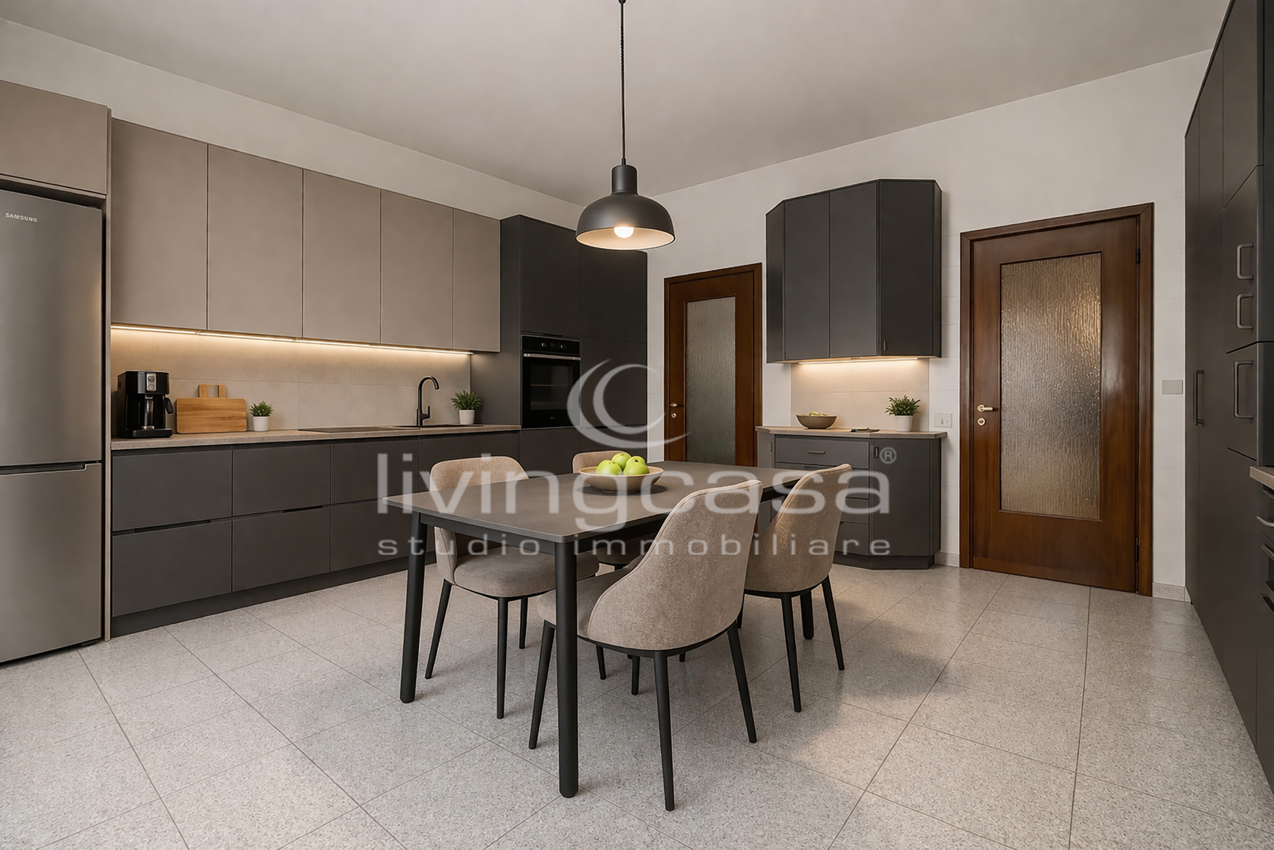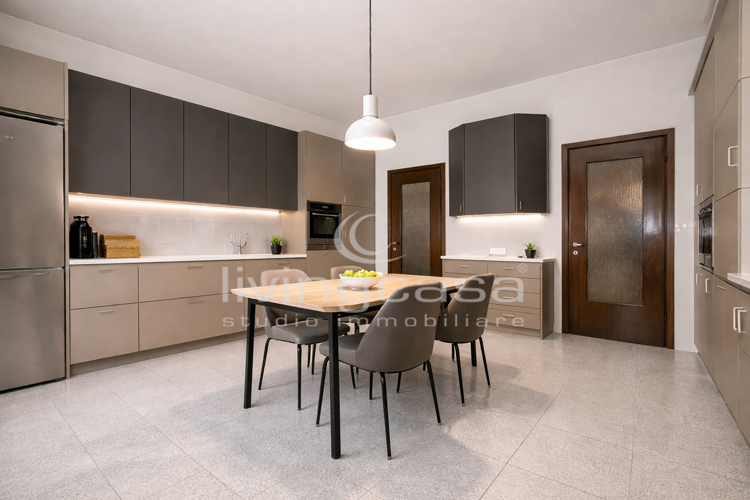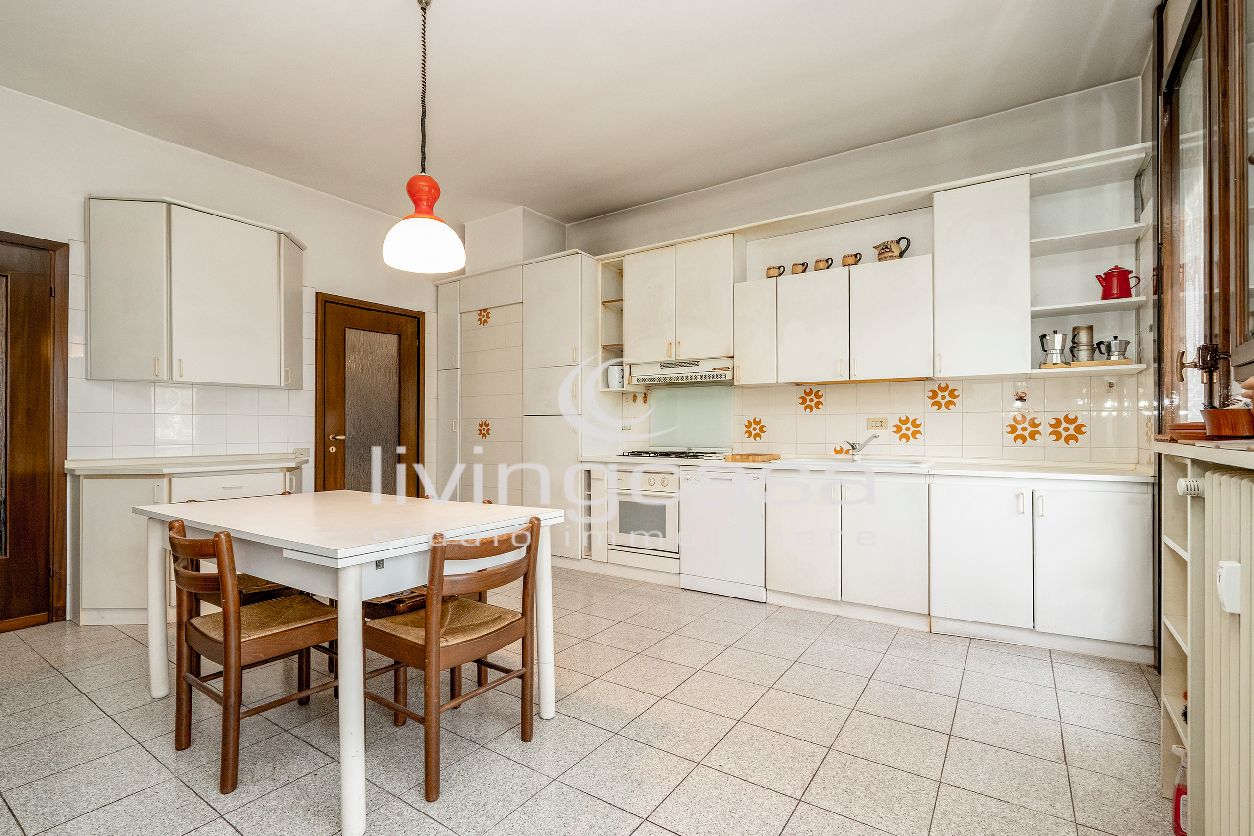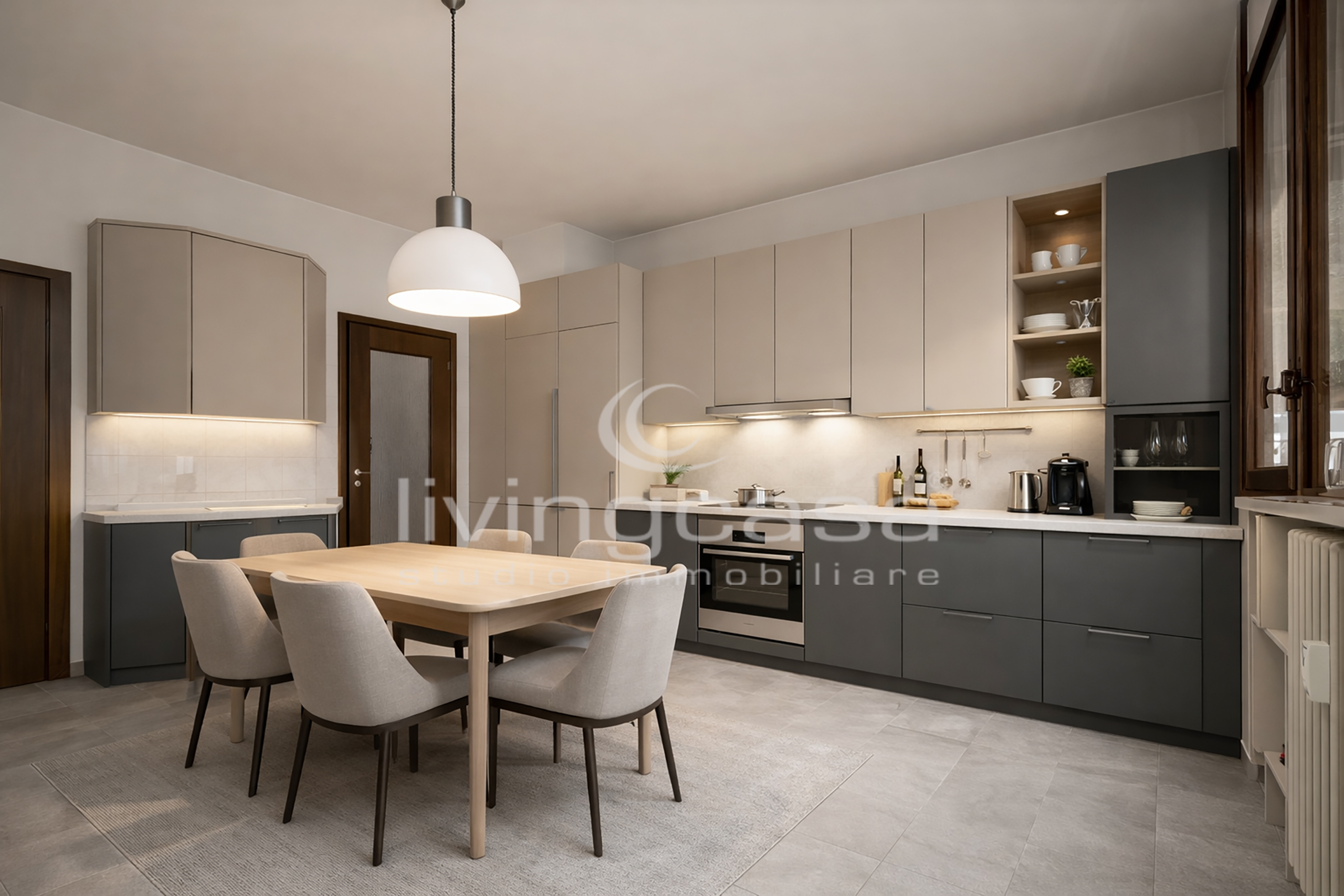La cucina è abitabile e ha l’uscita sul primo balcone: oggi è separata, ma domani potrebbe diventare parte di una grande zona giorno open space con isola centrale e affaccio esterno.