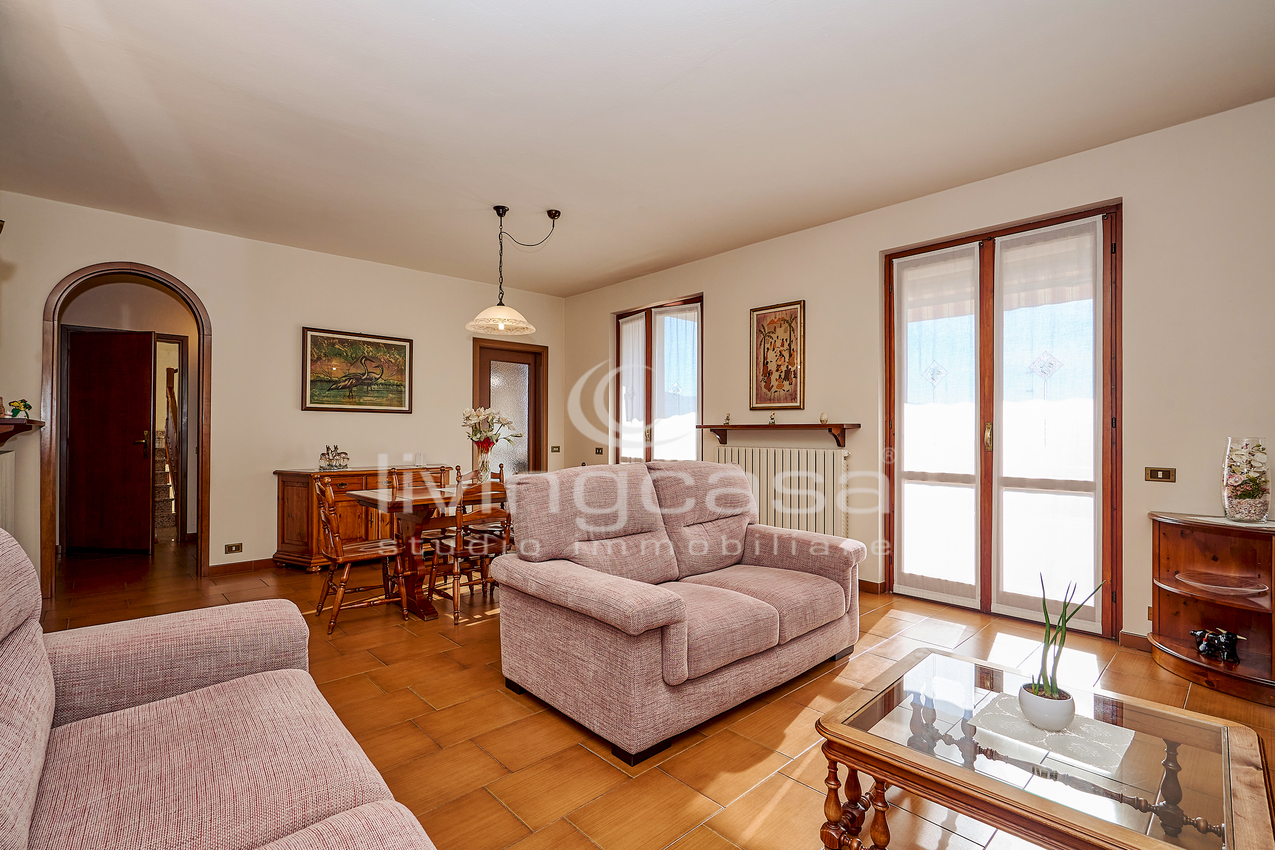 L’ingresso introduce direttamente nella zona giorno, ampia e luminosa, valorizzata dalla doppia portafinestra che lascia entrare luce naturale e apre lo sguardo sul panorama.