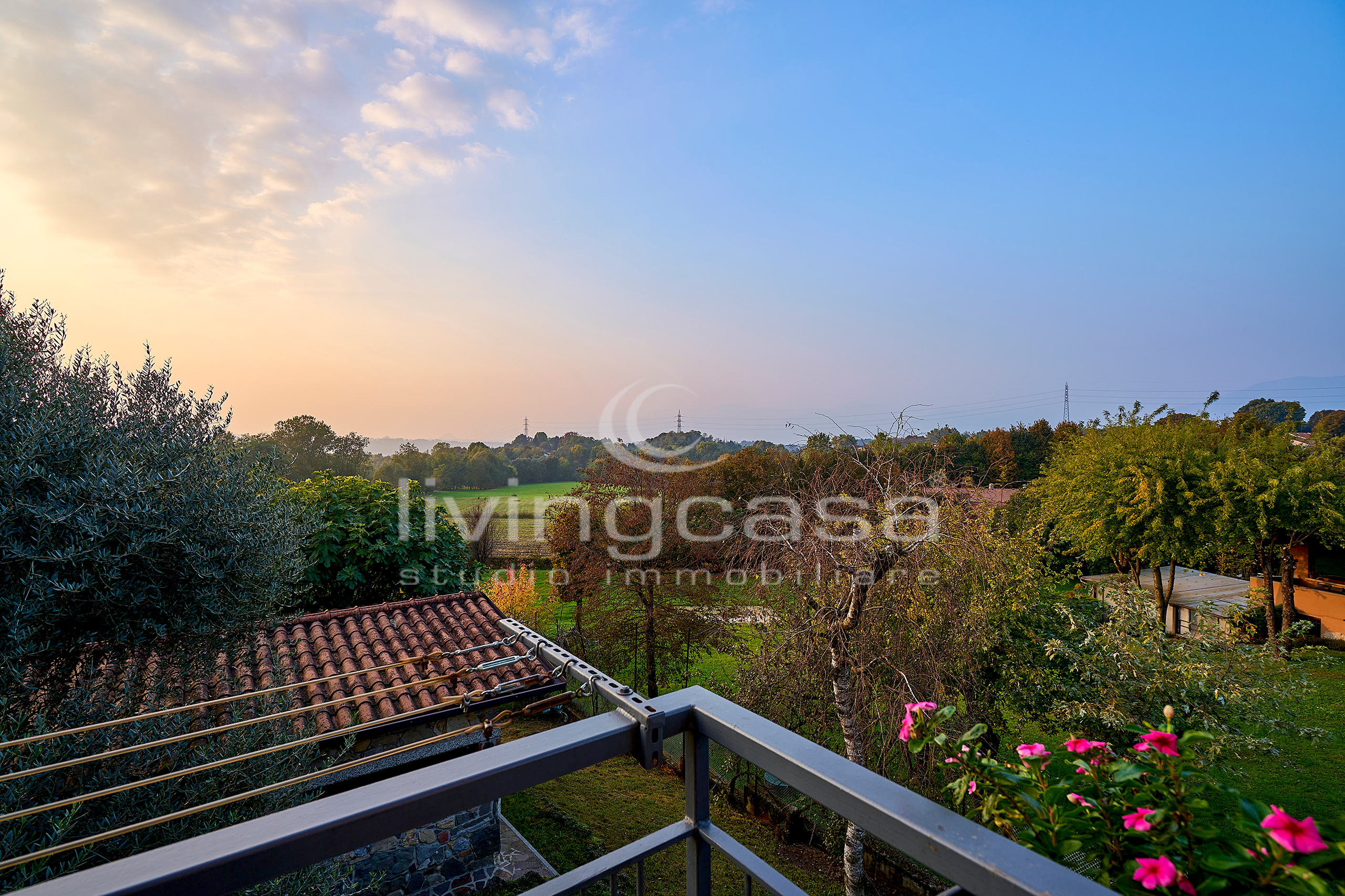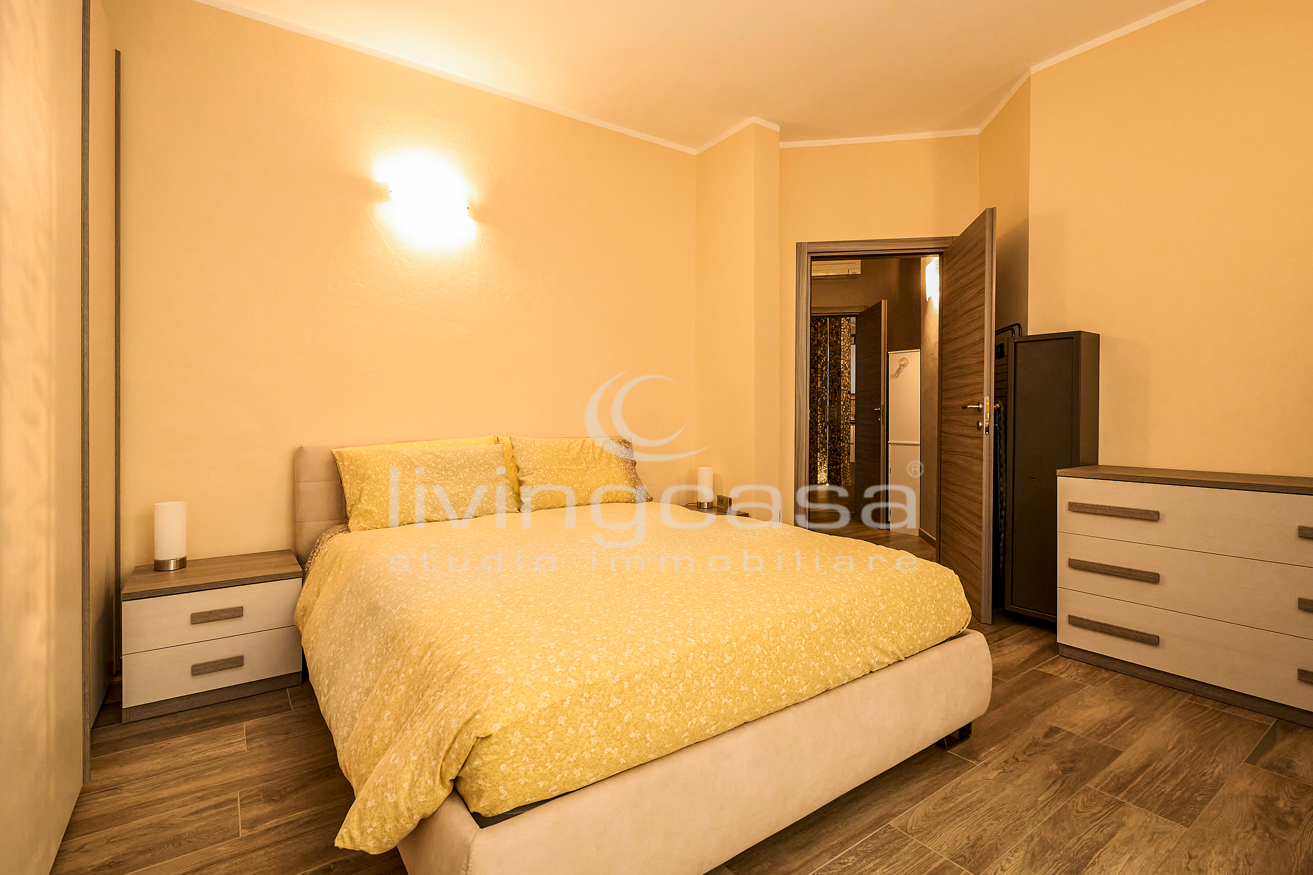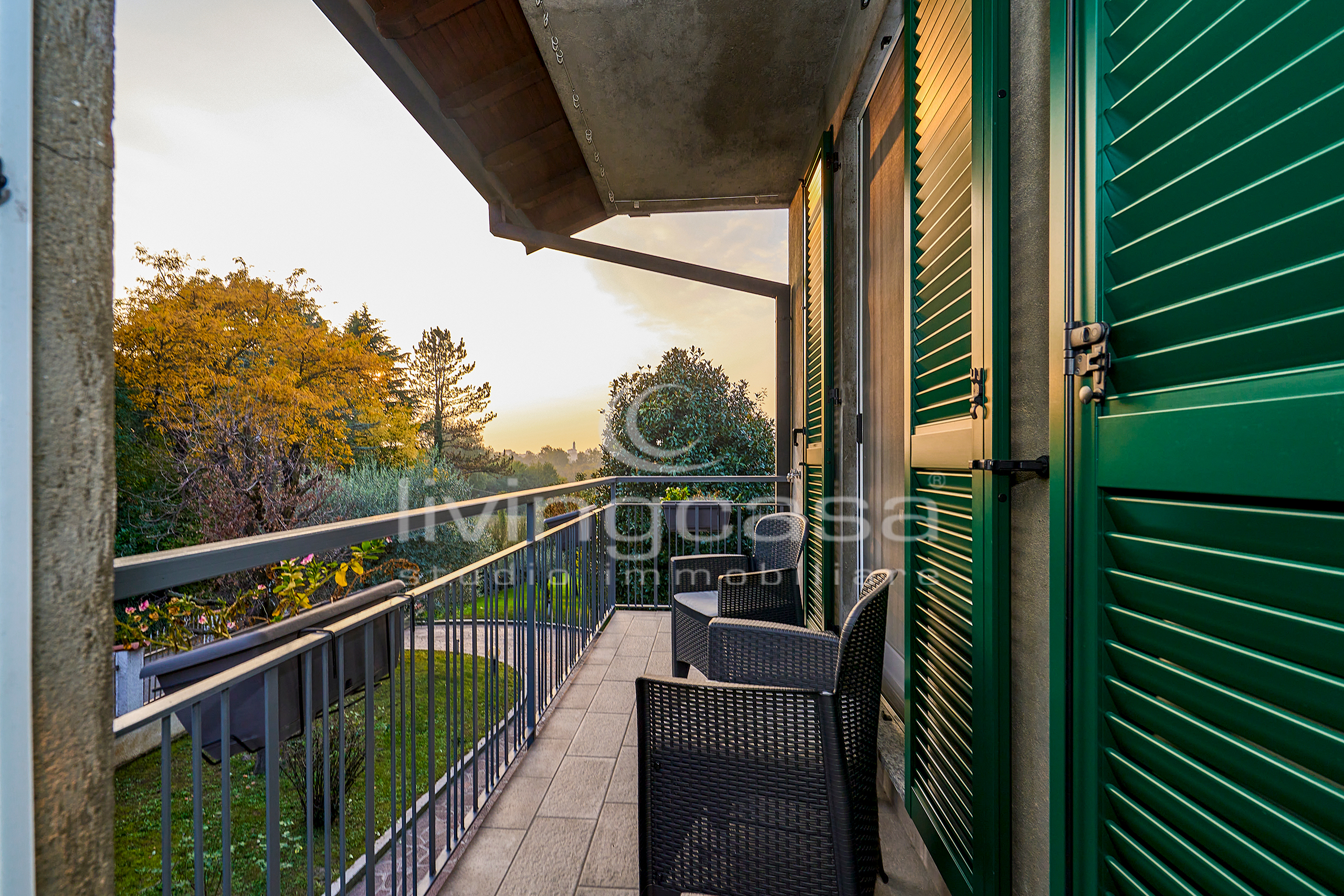 Il soggiorno, ampio e confortevole, è il cuore della casa: le porte-finestre si aprono su un secondo balcone, condiviso con la camera matrimoniale, dove respirare il verde e la quiete che circondano la proprietà.